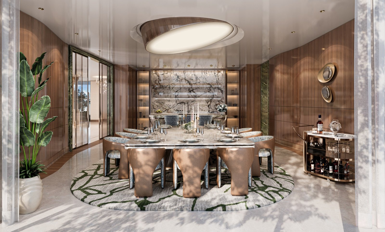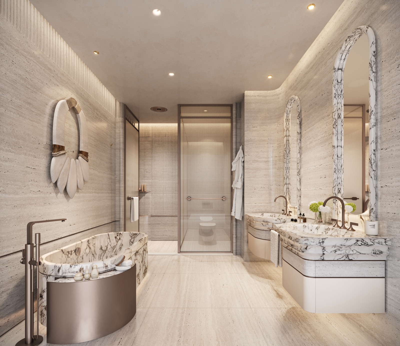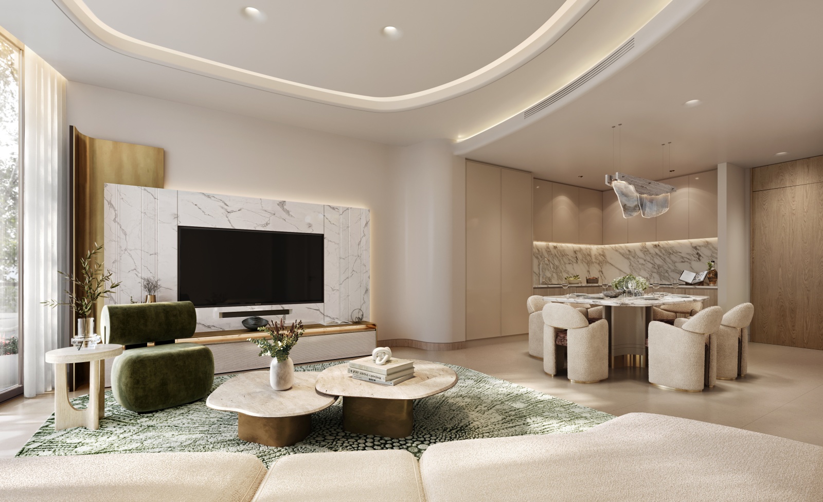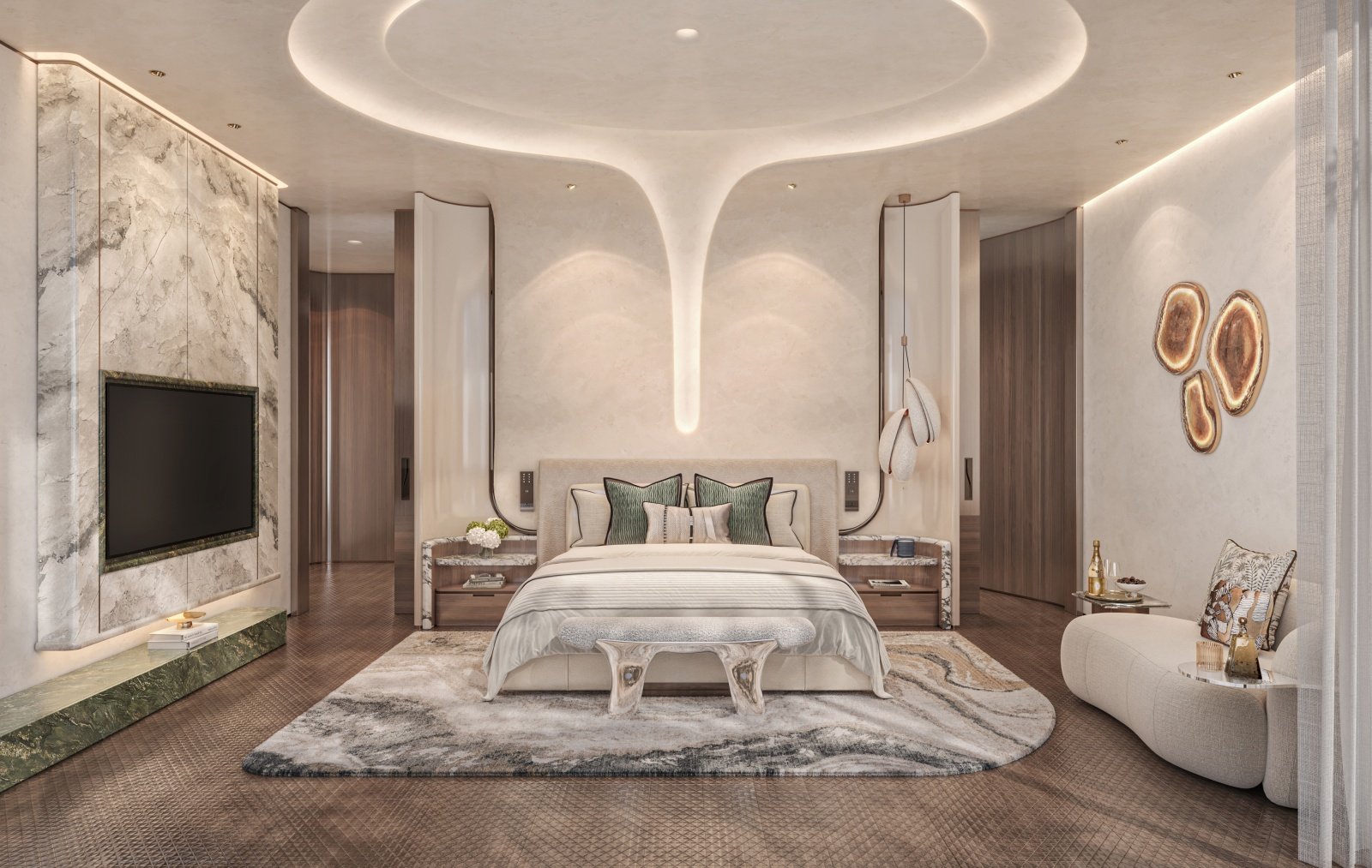 Oystra’s interiors are crafted to reflect the project’s overarching concept of fluidity and organic form. The design language blends luxury and natural elements, creating spaces that feel both refined and welcoming. The aesthetic is modern, with a focus on curvature, softness, and understated elegance.