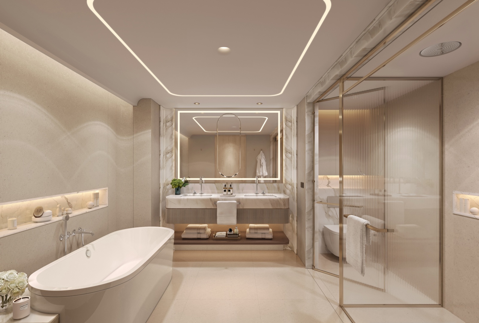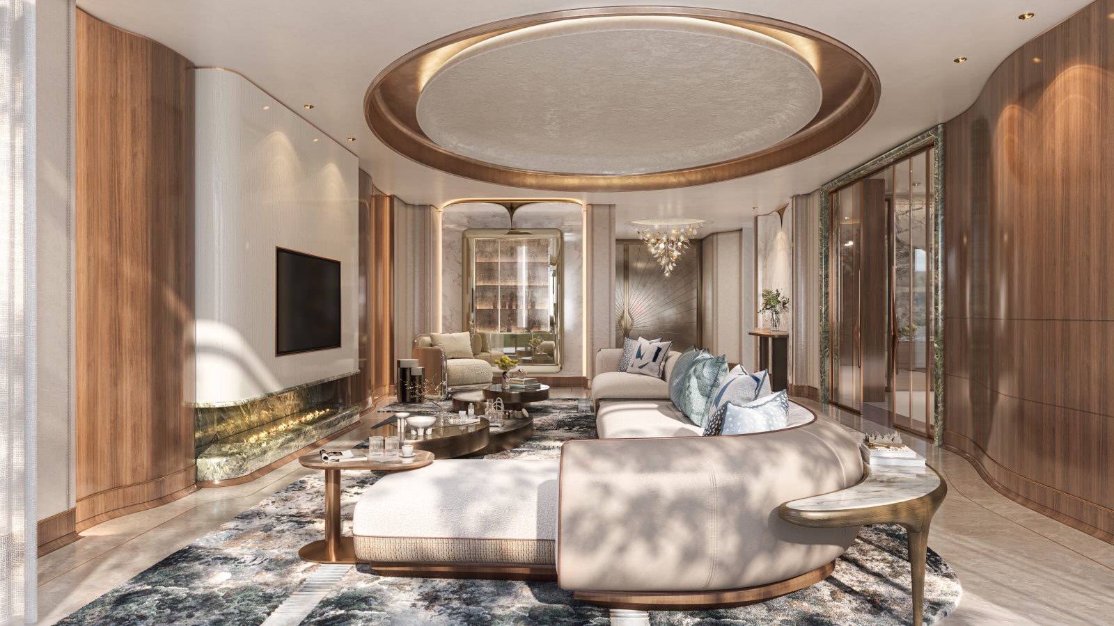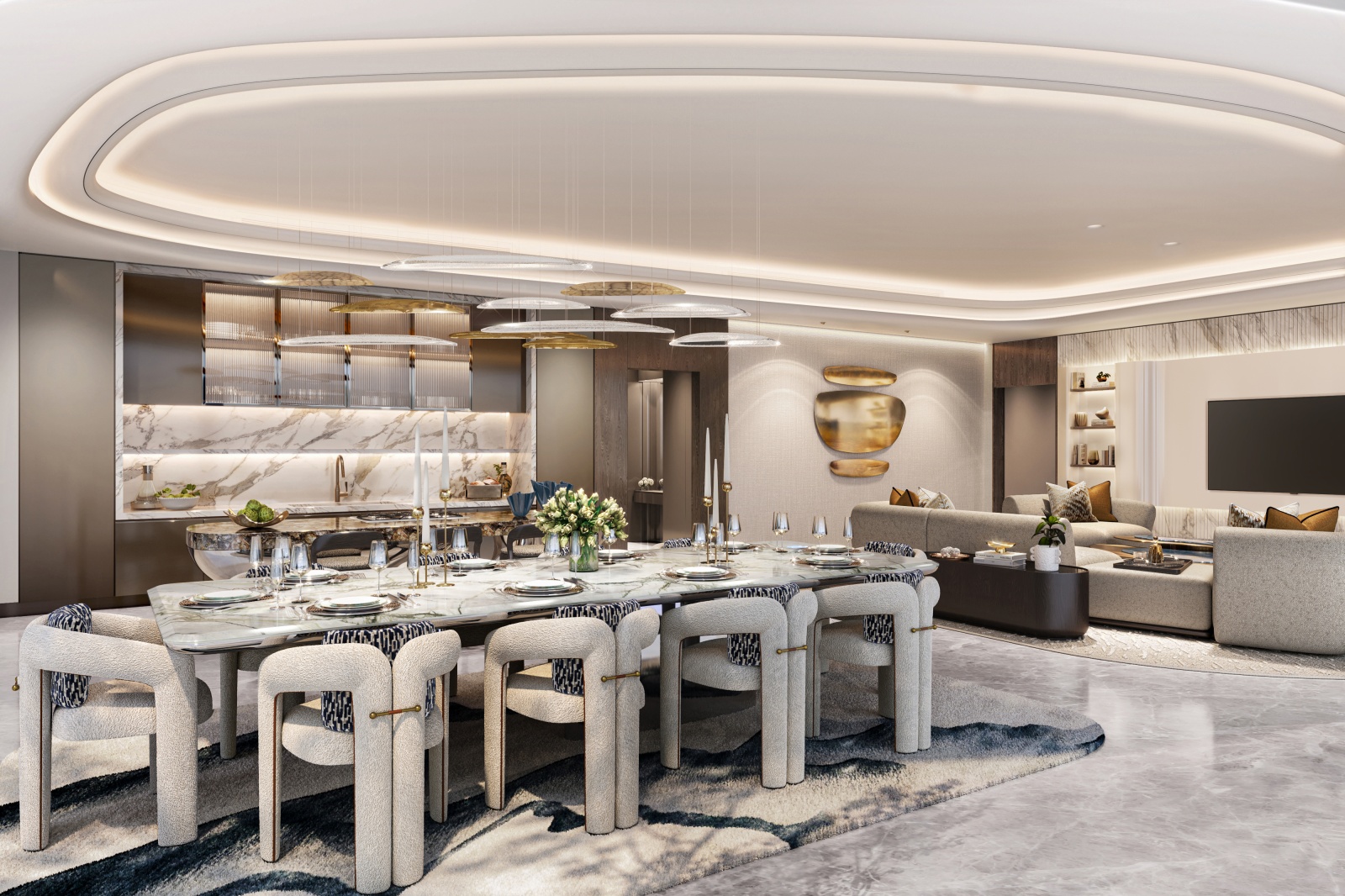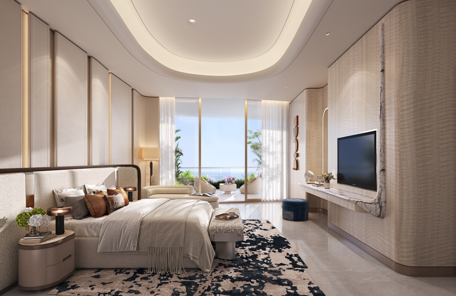 Oystra’s interiors are crafted to reflect the project’s overarching concept of fluidity and organic form. The design language blends luxury and natural elements, creating spaces that feel both refined and welcoming. The aesthetic is modern, with a focus on curvature, softness, and understated elegance.